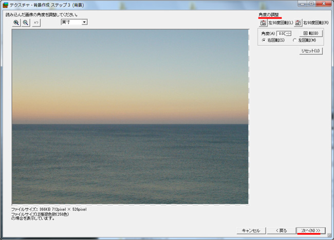 「テクスチャ・背景作成ステップ3(背景)」が表示されます。ここでは角度の調整ができます。必要に応じて調整した後に「次へ」をクリックします。
