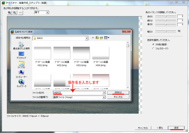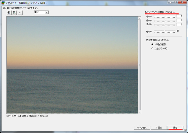 「テクスチャ・背景作成ステップ5(背景)」が表示されます。ここでは色と明るさの調整ができます。必要に応じて調整した後に「保存」をクリックします。