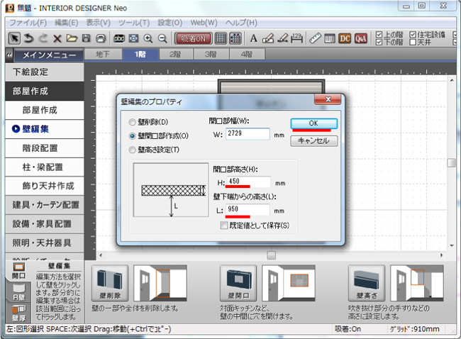 「開口部高さ」と「壁下端からの高さ」の数値を変更します。変更後はOKをクリックします。