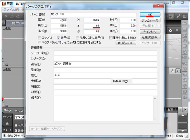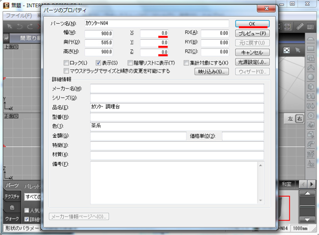 「カウンターN04」をダブルクリックして「パーツのプロパティ」を開き、XYZを「0」にします。OKをクリックします。