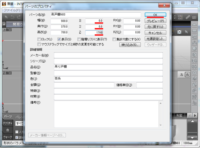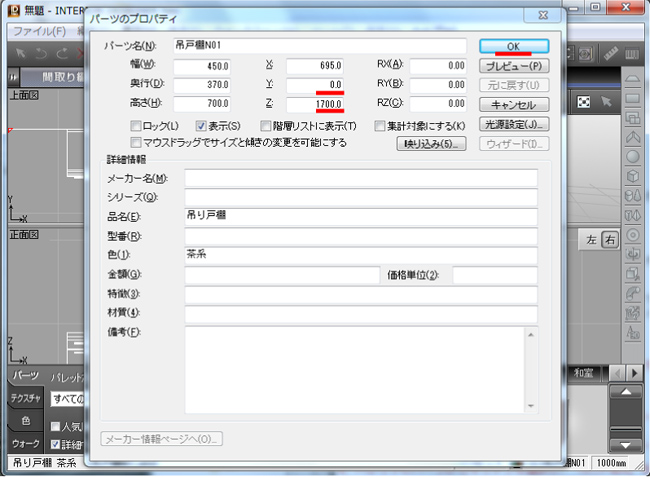 「吊戸棚N03」をダブルクリックして「パーツのプロパティ」を開き、XとYを「0」にして Zは「1700」にします。OKをクリックします