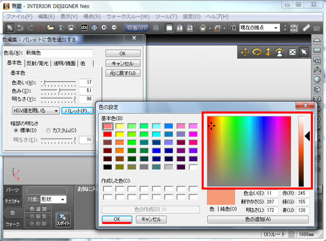 色のお気に入りの中に、作成した色のサムネイルが色名と共に表示されます。 |