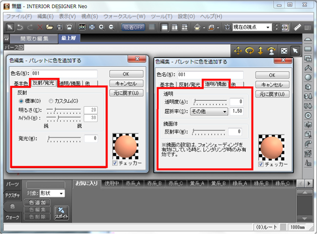 必要に応じて、「反射/発光」「透明/鏡面」を設定します。