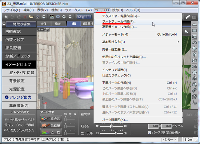 「イメージ仕上げ」の中の「アレンジ出力」をクリックします。 |