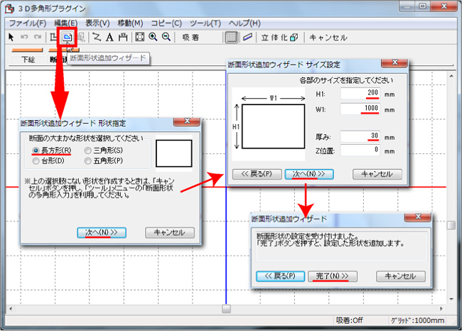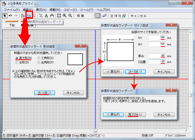 「3D多角形プラグイン」が表示されます。「断面形状追加ウィザード」をクリックします。