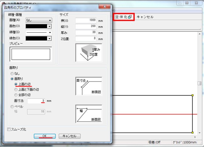 「四角形のプロパティ」が表示されます。「面取り」から上面の辺を選択して、面寸法の数値を入力します。「OK」をクリックして「四角形のプロパティ」を閉じます。