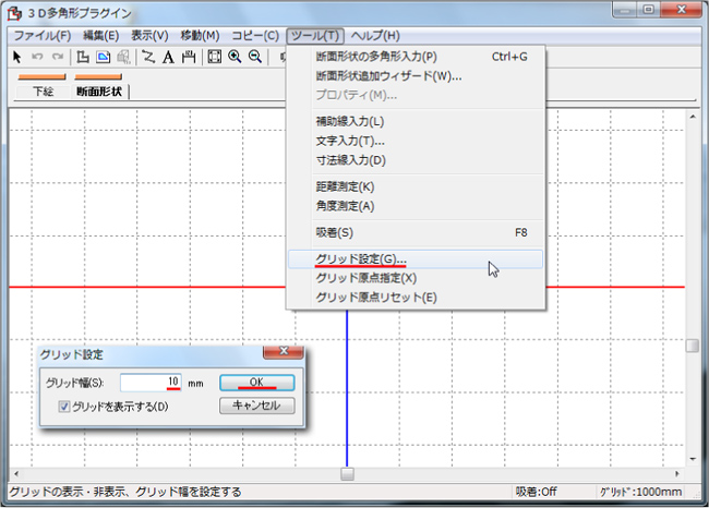 「3D多角形プラグイン」が表示されます。ツールから「グリット設定」をクリックします。「グリット設定」が表示されます。