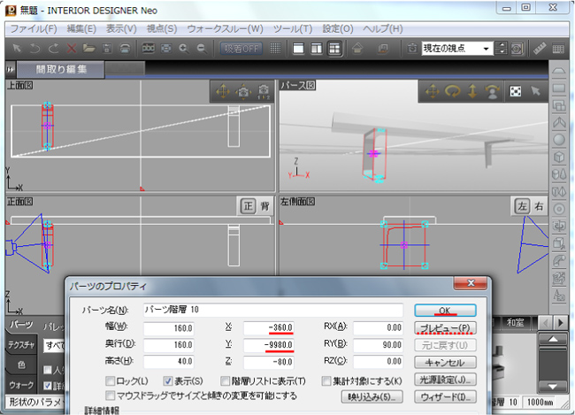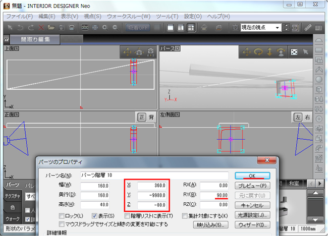 棚受けの形状を棚板の下部に移動させます。XYZから数値を入力して移動させRYの数値を入力して形状を90度回転させ、適切な位置にもっていきます。