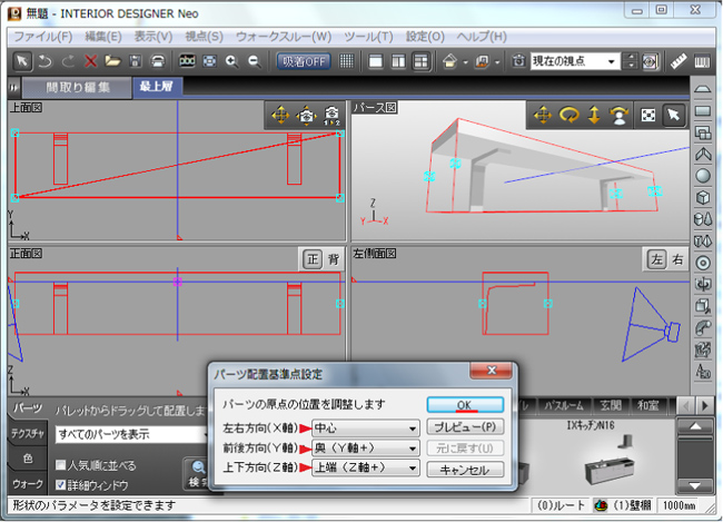 上の階層に移動すると、棚板と棚受けが一緒に選択された状態になります。部屋に配置しやすいように配置基準点を変更します。右クリックから「パーツ配置基準点設定」をクリックします。 |