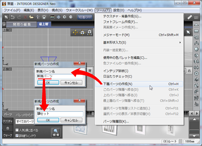 「ツール」から「上のパーツ階層へ移る」をクリックします。 |