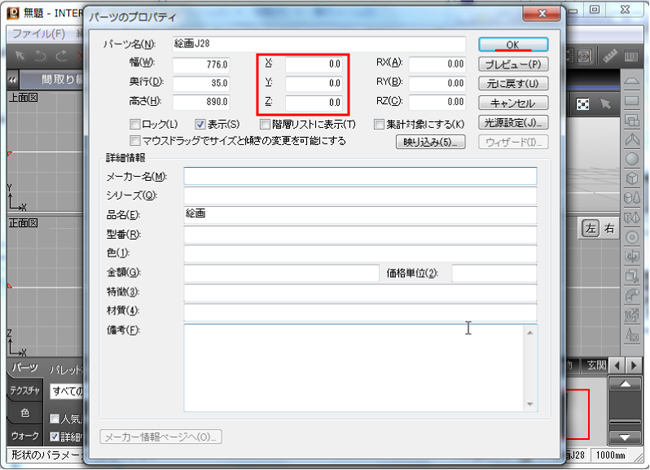 パーツをダブルクリックして「パーツのプロパティを表示」させXYZの数値を変更して「OK」をクリックします。