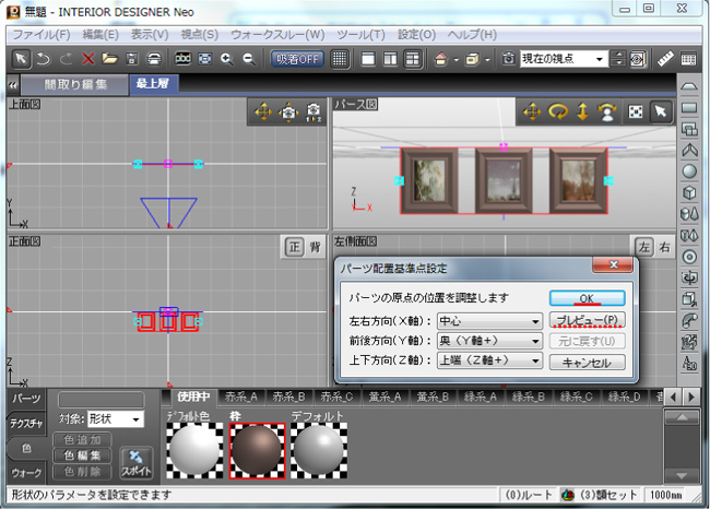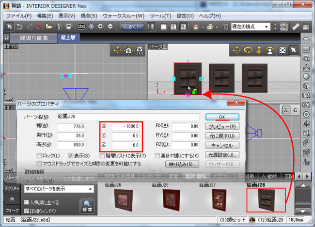 パーツパレットから「雑貨・趣味」をクリックして絵画パーツをドラッグ&ドロップでパース画面に配置します。 |