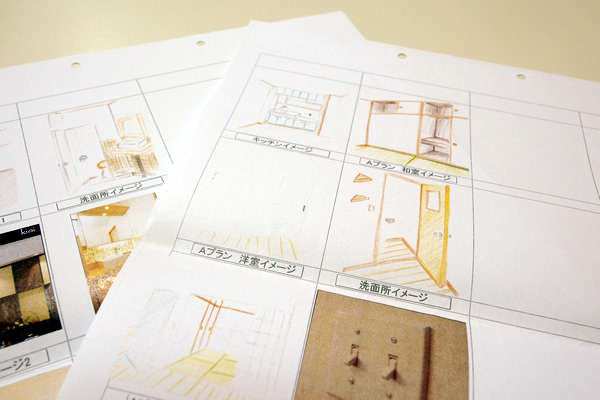 と建築士としてCADも扱える鴛海さんがいうとおり、当初のプレゼンは平面図と設備写真や建材サンプルというコンベンショナルなスタイルでした。当然ながらこれでは、建築については素人のオーナーさんにうまく伝わらず、提案を受け入れてもらうことが難航しました。そこで一計を案じた五家さんはイラストを描いて添付することにしました。