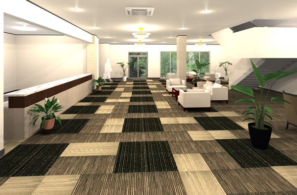 「法人案件、特に商業施設ではアクセントとしてカーペットや床材を貼り分けるのがインテリア提案のポイントになります」