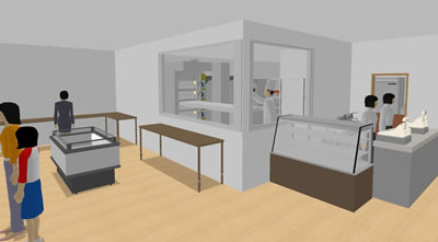 製菓・製パンの店舗では、他の飲食店に比べて製造用の機材が大きいので、厨房の面積を広くとる必要があります。ホールと厨房の広さのバランスを理解してもらうのにも3Dパースは最適です。