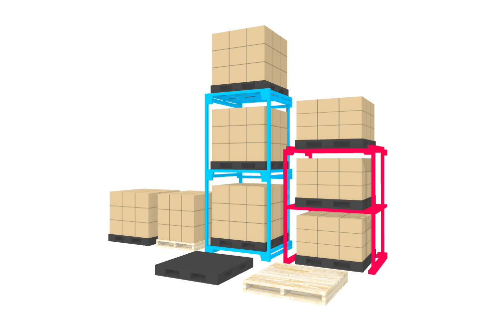 段ボールのままでの取扱は、パレットと呼ばれる荷物を載せる荷役台で、段ボールをパレットに乗せたまま、フォークリフトなどを使ってトラックに積込みます。そこでのレイアウトは、パレット単位での保管に適した配置になり、保管効率を上げるために、天井高く、ネステナーと呼ばれるパレット保管専用の什器を使って、商品が段ボールの重さで潰れないように、段ボールの上げ下げをなるべく少なくできるような什器とレイアウト構成が必要になります。