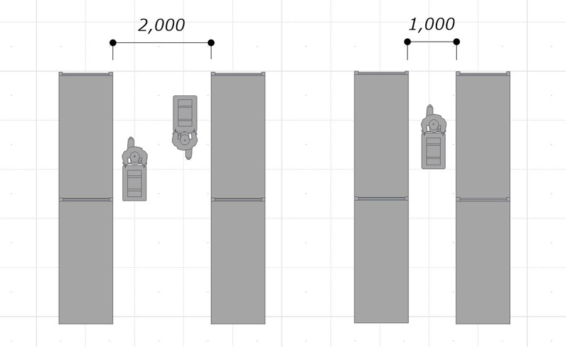 また、その場合は、フォークリフトでの作業となるため、フォークリフトの旋回など含め、物流倉庫内の通路幅を考慮したレイアウトになります。一般的なフォークリフトだと、機種にもよりますが、約3000mmが必要となり、保管効率と作業効率は、両方とも物流コストを下げるには、大切なのですが、レイアウトを組む上で、どちらを優先するかを検討する必要があります。