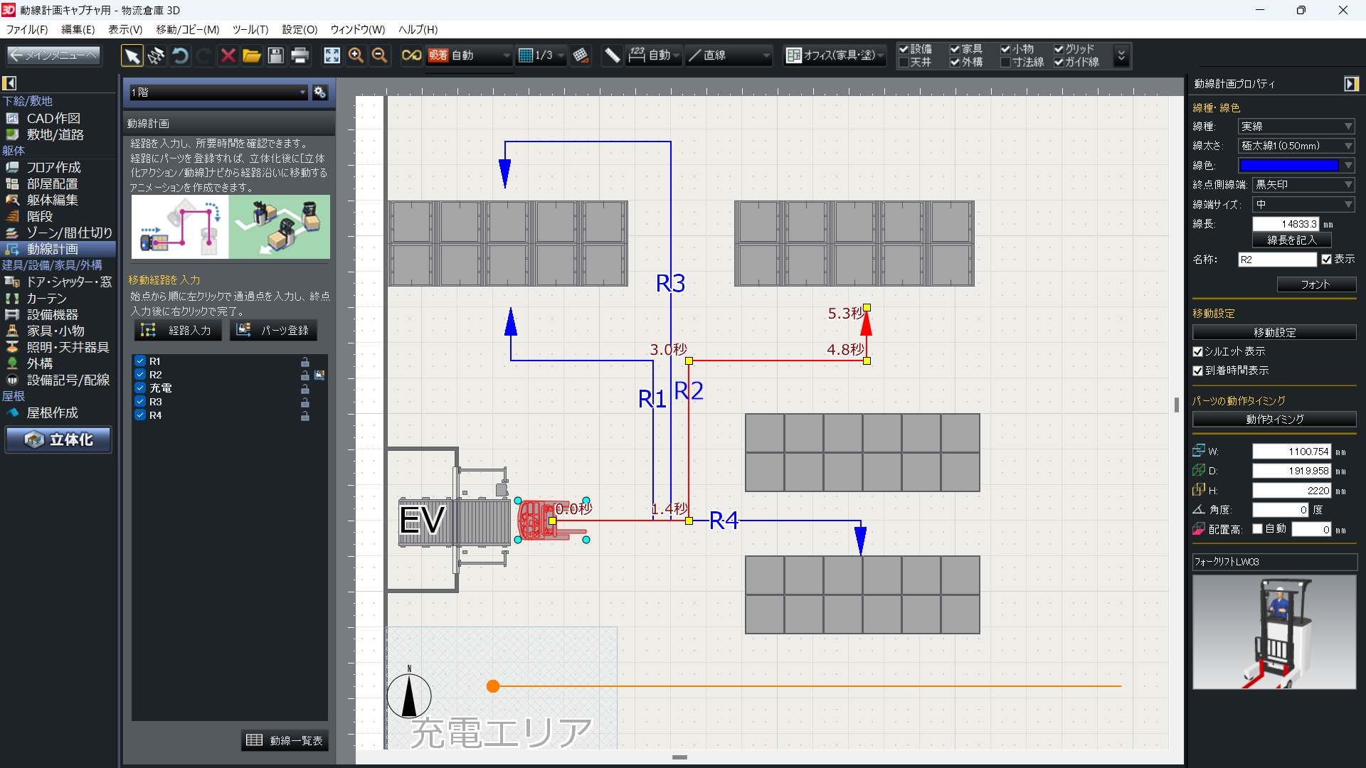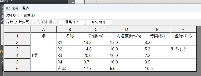 レイアウトされた平面図に経路を入力し、フォークリフトや人の移動にかかる距離や時間をシミュレーションできる動線計画機能を搭載。 各経路毎ごとの一覧表も出力できます。またCSV出力にも対応し、Excelで編集 してトータル作業時間の算出にも使えます。