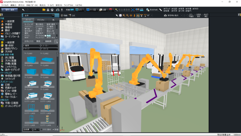 フォークリフトやロボットアーム、歩行人物など可動対応した3Dパーツに加え、ユーザーからご要望の多かったシャトル式自動倉庫も収録。他にもホイストクレーン、R500のカーブコンベア、半間口のパレットラックなど細かなニーズにも対応しました。