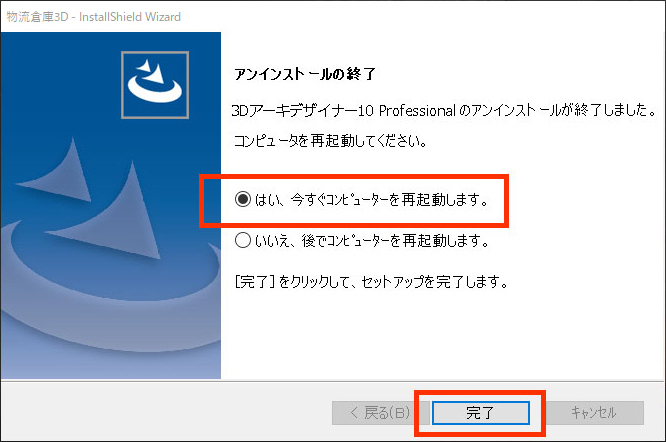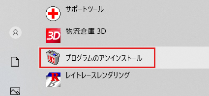 スタートメニューから「物流倉庫3D」を探し、「プログラムのアンインストール」を選択してください。あとは手順にそってアンインストールを行ってください。アンインストール後はパソコンを再起動してください。