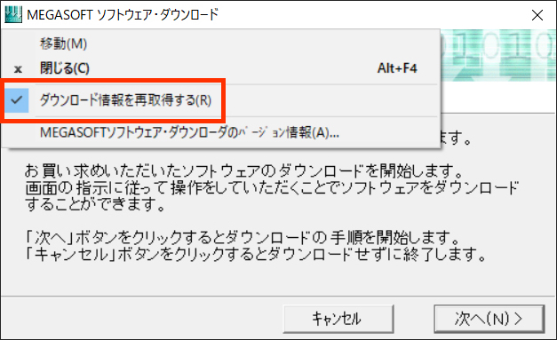 画面左上のアイコン部分をクリックして「ダウンロード情報を再取得する」を選択し「次へ」のボタンを押してください。※以前のダウンロード情報のキャッシュをクリアし、エラーを回避します。