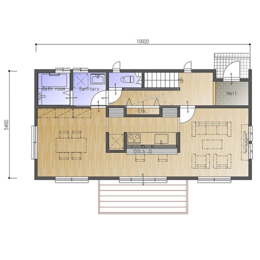 【間取り・注文住宅プラン】大きなデッキとLDKの中心にキッチンがある、楽しい3LDKの間取り
