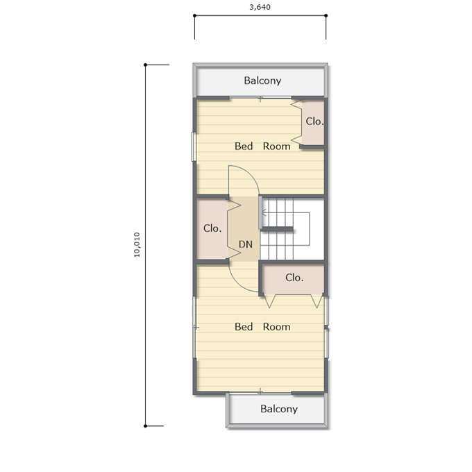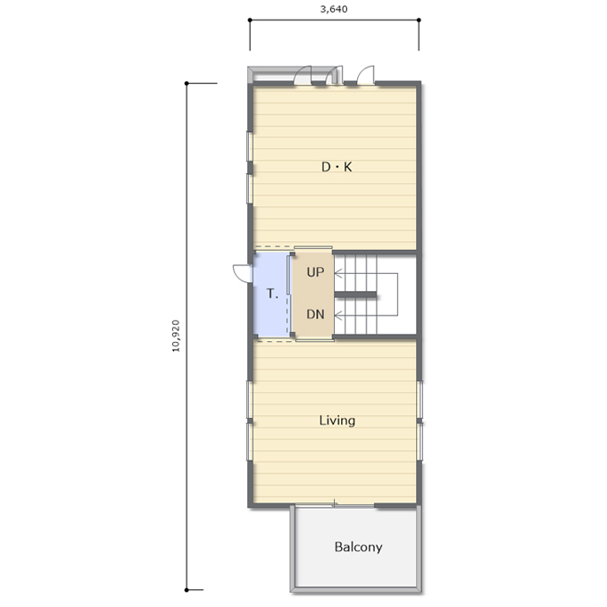 間口二間(3640㎜)という細長い敷地に建つ、ダイニングキッチンとリビングを独立させた3階建ての間取りになります。