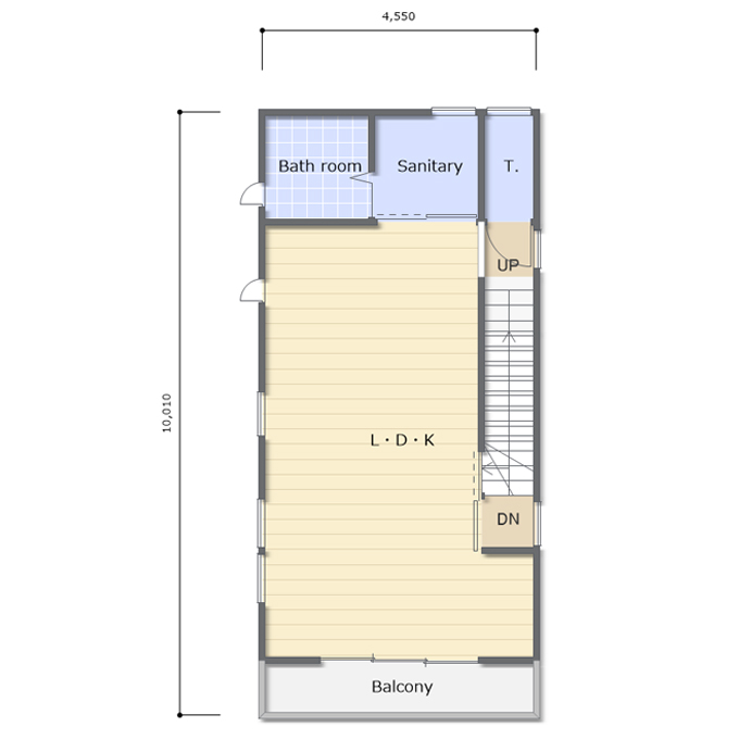 建物間口が2間半(4550㎜)取れる敷地で、一階部分にカーポートを設けた3階建ての4LDKの間取りの例になります。