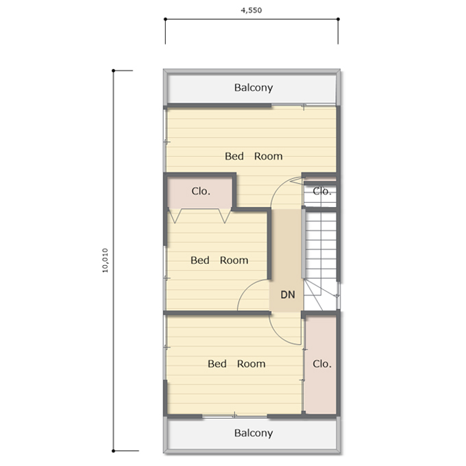 先ほどの建物より建物の奥行が3尺(910㎜)拡がりましたので斜線の想定をしても三階にラクに三部屋配置することができます。