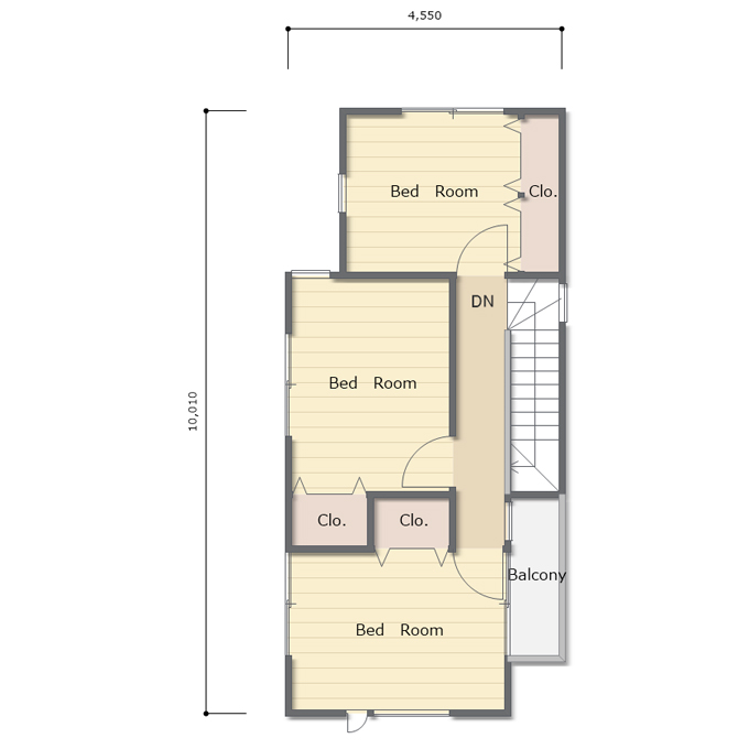 このプランでは北側斜線がない地域を想定して三部屋としました。真中の部屋は通常であれば開口部が一つしかとれないのですが建物を適度に凸凹させることにより、真ん中の部屋も二面開口とすることが出来ました。