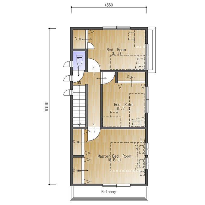 東玄関、東西の間口2.5間(4550㎜)、南北の奥行が5.5間(10010㎜)の参考プランで、