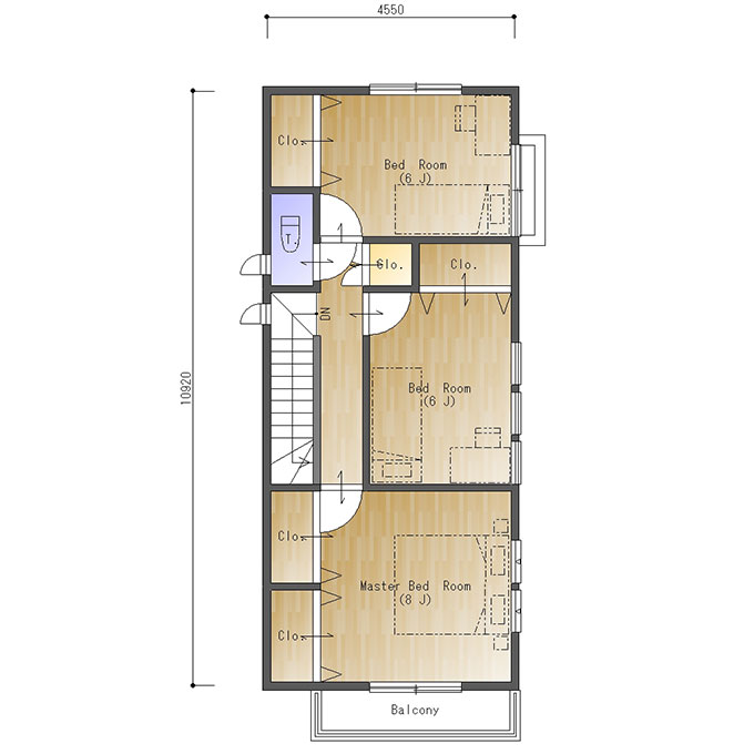 南側には8帖の主寝室。二間分のクロゼットを設けています。バルコニーがあるので開放感を得られるお部屋になっています。