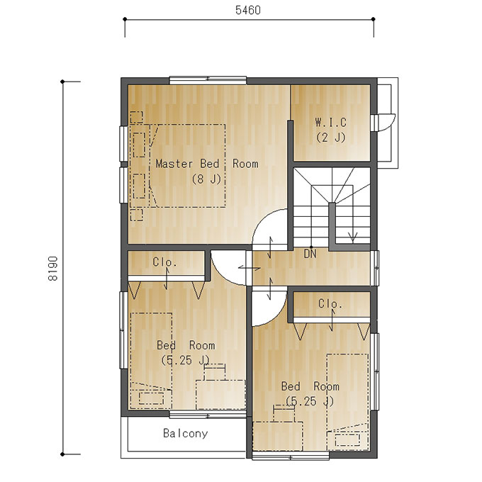 東玄関、東西の間口3.0間(5460㎜)、南北の奥行が4.5間(8190㎜)の参考プランです。