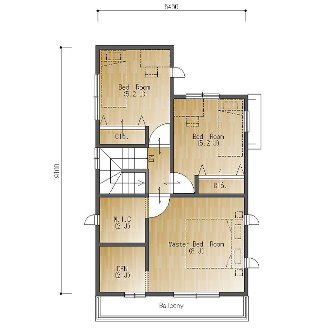 二階は子供部屋が二部屋と主寝室。できるだけ部屋のスペースを広くとれるように工夫しています。子供部屋はどちらもクロゼットつきの5.2帖。主寝室は8帖で、2帖のウォークインクロゼットと、同じく2帖の書斎を設けています。これだけ広いクロゼットなら、ご夫婦の衣類もたっぷりと収納できるでしょう。また、書斎はリモートワークや読書、趣味のスペースにも使えて便利です。