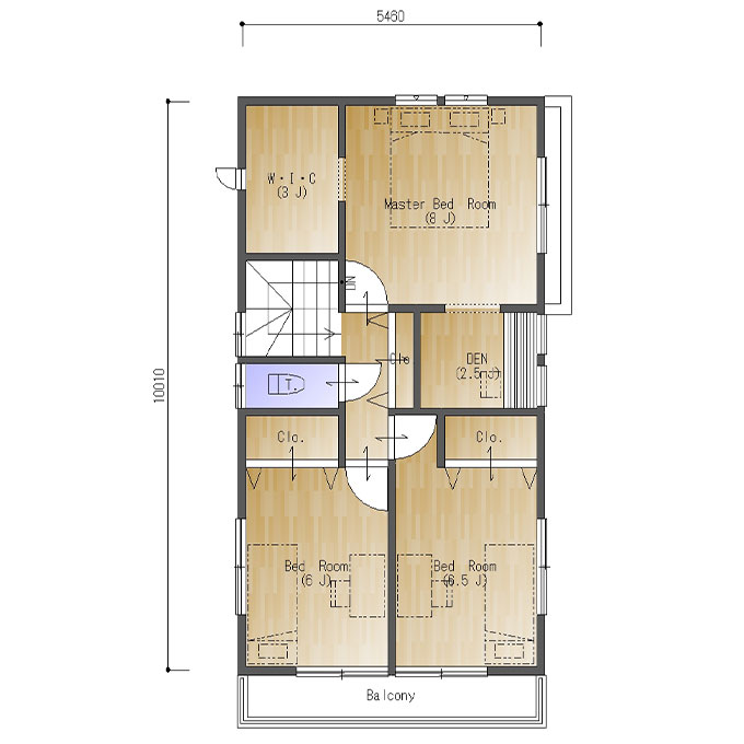 東玄関、東西の間口3.0間(5460㎜)、南北の奥行が5.5間(10010㎜)の参考プランです。