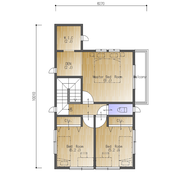 北側の主寝室は8帖。2帖のウォークインクロゼットと、同じく2帖の書斎を設けています。東側にバルコニーがあるので、明るく開放感がありますね。