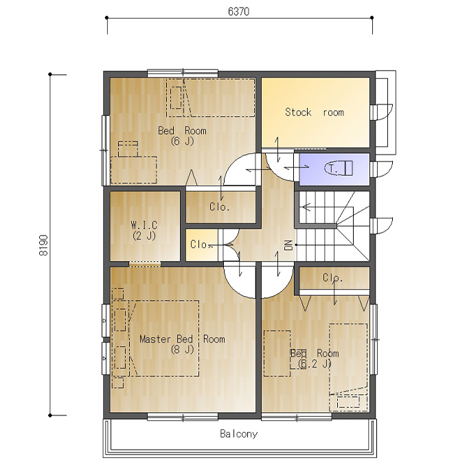 二階には、南側のバルコニーに面して8帖の主寝室と6.2帖の洋室、ホールを挟んだ北側に6帖の洋室と納戸、トイレをレイアウト。ゆとりある部屋サイズに加え、主寝室にある2帖大のウォークインクロゼットや大きめの納戸、ホールのクロゼットなど、充実した収納も嬉しいですね。主寝室と二つの洋室はいずれも二方向に開口部を設けた角部屋なので、採光・通風にも恵まれています。