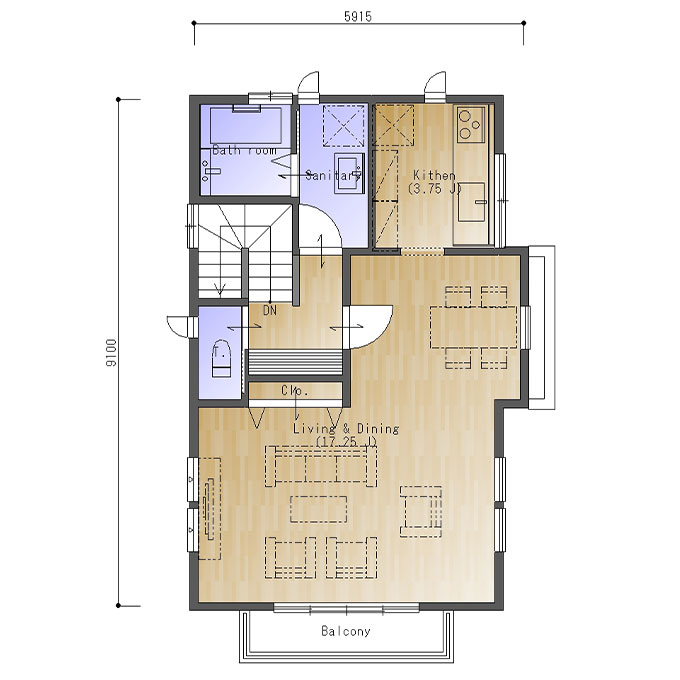 二階のキッチンは3.75帖、LDは17.25帖の広さです。リビングはダイニングテーブルやソファを配置しやすい間取りです。L字型のソファなども置けそうですね。南側にはバルコニーがあり、二階ならではの明るい光を取り込めます。また三方向に窓があるため、通気性も抜群です。リビングには程よい大きさの収納があり、身の回りのちょっとした荷物を収納することができます。
