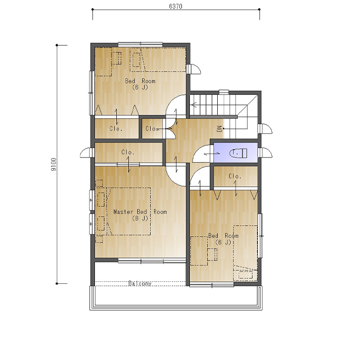 二階の主寝室は8帖あり、キングサイズのベッドを置いても十分な広さ。それとは別に3帖のウォークインクロゼットがついています。3帖あれば、ご夫婦の衣類もたくさん収納できそうですね。主寝室の南側には、南東側の子供部屋とつながる広々としたバルコニーがあり、明るい光が取り込めます。北西の子供部屋は二方向に窓があるので、通気性に優れています。