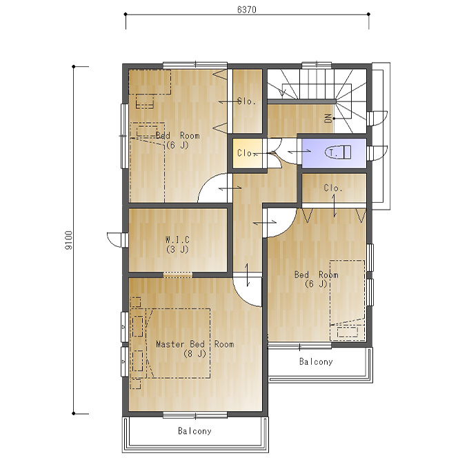 二階の主寝室は8帖あり、それとは別に3帖のウォークインクロゼットがついています。3帖あれば、ご夫婦の衣類もたくさん収納できますね。主寝室と南東の子供部屋の南側にはそれぞれバルコニーがあり、明るい光を取り込むことができます。二つある子供部屋はどちらも6帖の角部屋なので、通気性に優れています。