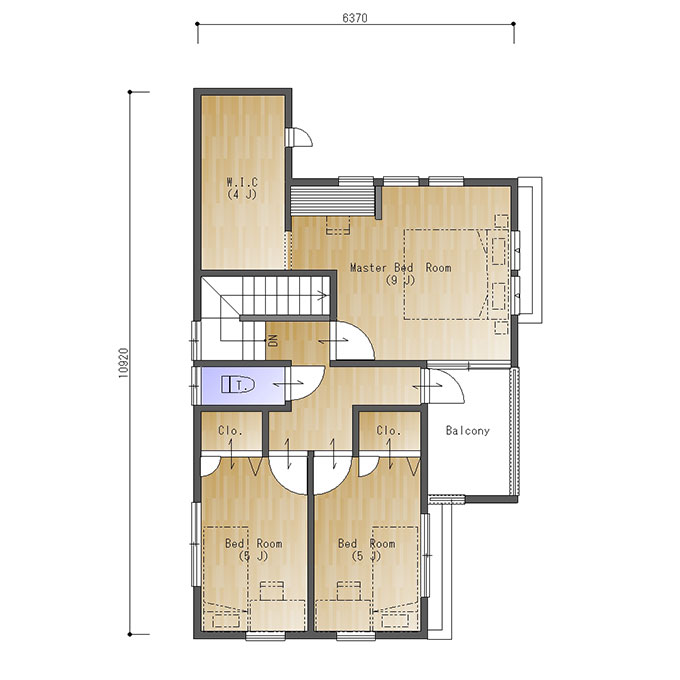 二階は、主寝室と子供部屋が二部屋。9帖の主寝室には、4帖のウォークインクロゼットがついています。クロゼット横にカウンタースペースを設置。机としても化粧台としても使えます。