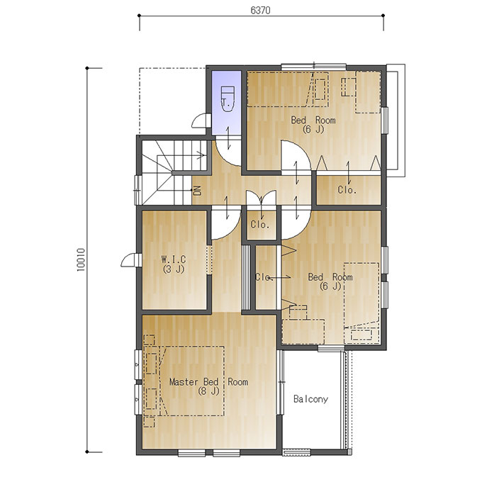 8帖の主寝室は、ドアから3帖のウォークインクロゼット前を通る通路の先に配置しています。主寝室のドアを開けっぱなしにして就寝しても、廊下から寝姿が見られない設計です。