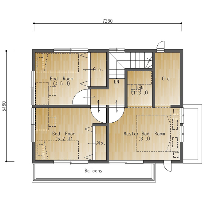 東玄関、東西の間口4.0間(7280㎜)、南北の奥行が3.0間(5460㎜)の参考プランになります。