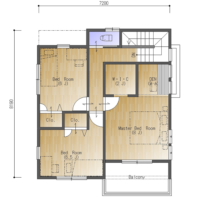 二階の主寝室は8帖で、キングサイズのベッドを置いても十分な広さです。主寝室の隣には2帖のウォークインクロゼットがあり、洋服などをしっかり収納することができます。また、2帖の書斎スペースはリモートワークに活用できそうですね。