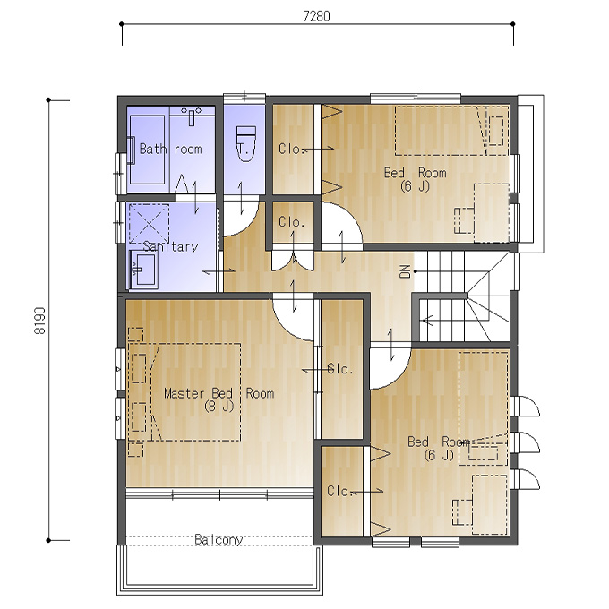 二階の主寝室は8帖で、キングサイズのベッドを置いても十分な広さ。二階の三部屋はいずれも二面採光で、採光性と通気性に優れた角部屋です。また、各部屋の間に階段とクロゼットを配置することで、プライバシーにも配慮しています。