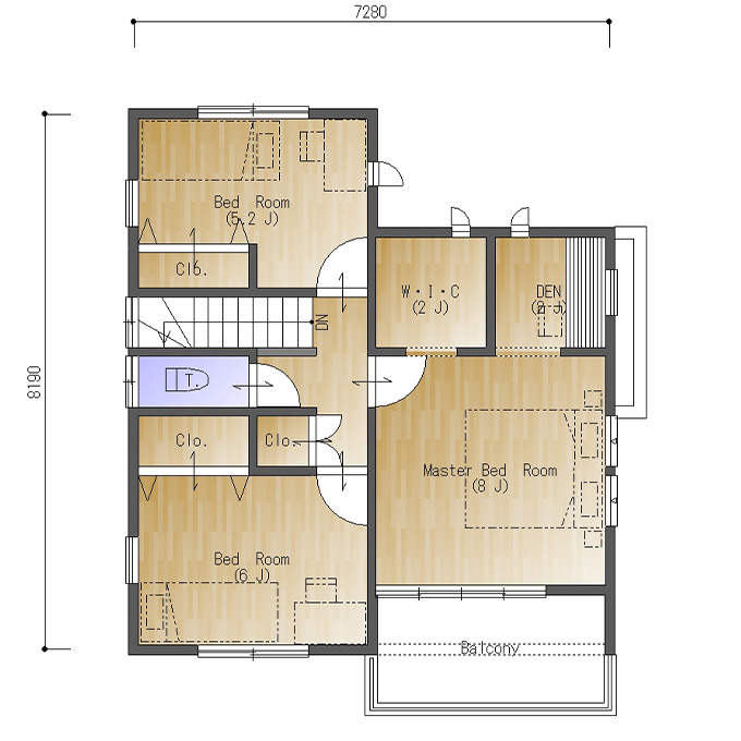 二階は二つの子供部屋と主寝室があります。子供部屋は角部屋でそれぞれの部屋にクロゼットが設けられています。主寝室は8帖の広さとは別に、2帖のウォークインクロゼットと書斎を配置。南面に奥行きのあるバルコニーがあります。