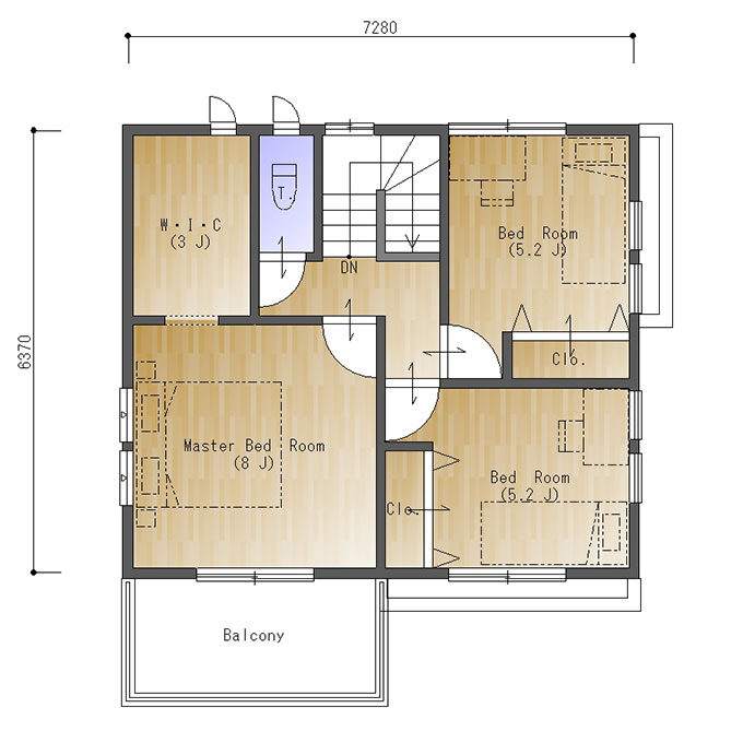 二階には、二つの子供部屋と主寝室を配置。子供部屋はそれぞれ5.2帖でクロゼットがついています。8帖の主寝室の北側には3帖のウォークインクロゼットがあります。主寝室はバルコニーに面しており、開放感のある空間となっています。