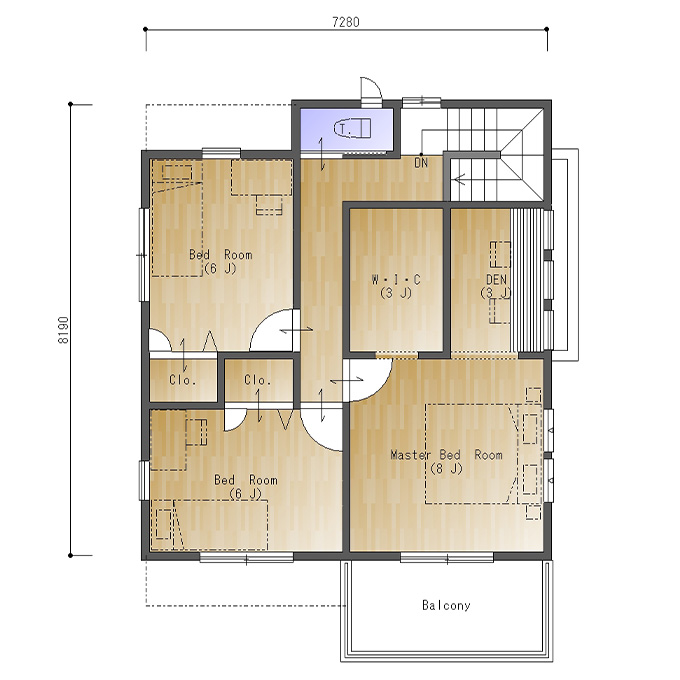 二階には、それぞれ6帖の子供部屋が二部屋と8帖の主寝室があります。子供部屋は互いの部屋のクロゼットを挟んで配置。これが防音璧の役目をしてくれますね。