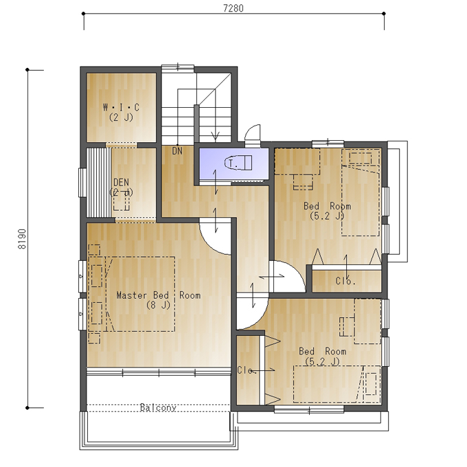 バルコニーは少し奥行きがあるため椅子を置いてご夫婦でくつろげる空間にするのも良いですね。2帖のウォークインクロゼットを設け、収納も充実した主寝室となっています。