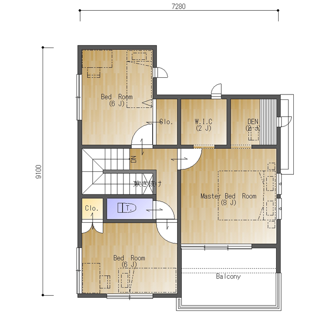 二階は三部屋とトイレを配置しました。主寝室には2帖の書斎コーナーとウォークインクロゼットを用意し、充実の空間に。広いバルコニーもあり、テーブルセットを置けばご夫婦のくつろぎのスペースにもなります。